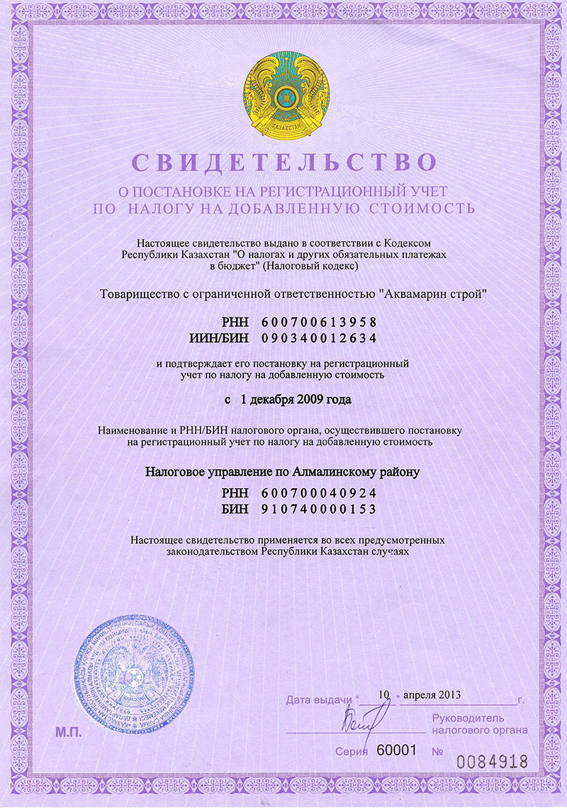 Свидетельство о постановке на рег. учет по НДС