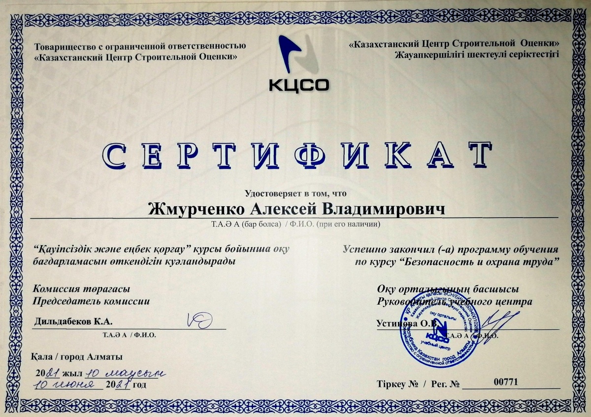 Сертификат по курсу "Безопасность и охрана труда"